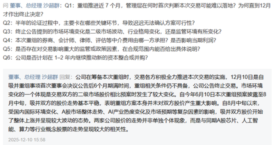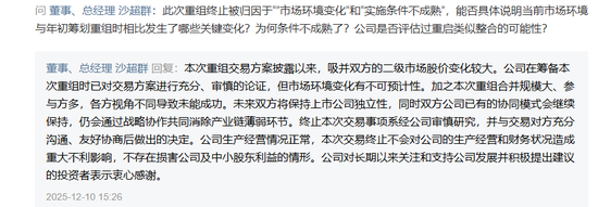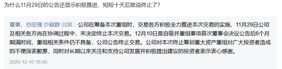 还有投资者提问:为什么11月29日的公告还显示积极推进,短短十天后就说终止了?