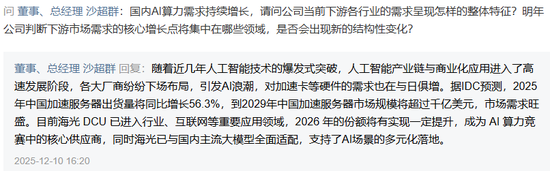 他介绍,海光信息作为独立芯片供应商,为整个国产服务器行业提供核心算力芯片;中科曙光则作为整机厂商与其他芯片企业合作,形成“芯片厂商竞争+整机厂商择优采购” 的市场化生态,推动国产算力产业链的多元协作与良性竞争。