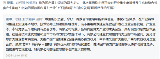沙超群表示,当前没有实现重组,对两家公司的经营发展不会产生大的影响。两家公司均属于当前我国算力产业的龙头企业,具有明显的领先技术底蕴,在自身技术迭代发展和资本市场助力的双螺旋作用下,两家公司独立发展也具有充足的市场空间。